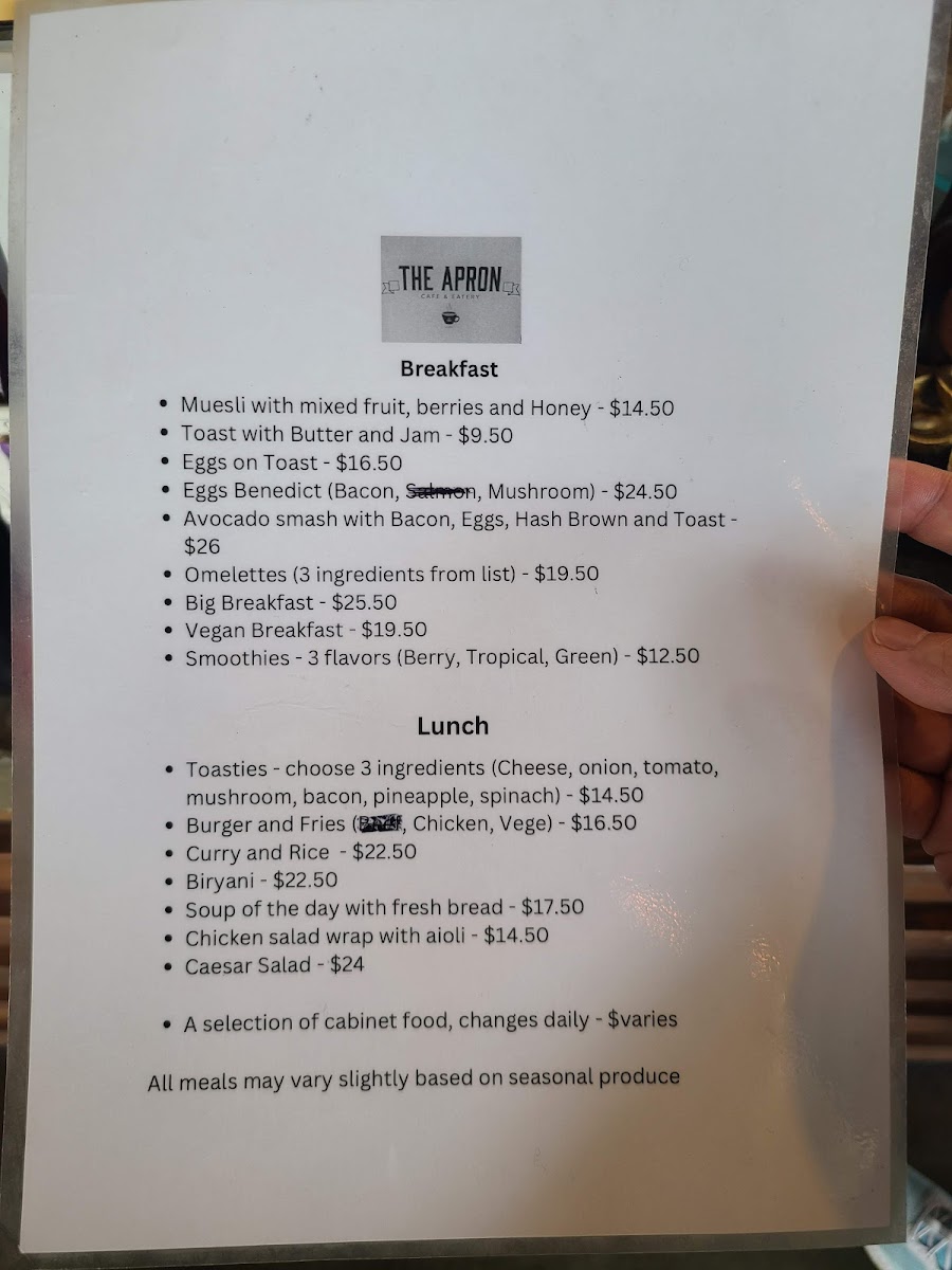 Finally, for a sweet and refreshing finish, the Shakes/Iced Drinks are a must-try. Options like Strawberry, Ice Chocolate, Ice Coffee, Oreo, and Vanilla are guaranteed to satisfy your sweet tooth. For something healthier, the Smoothies such as Super Charge (Blueberry & Banana) and Green (Spinach, Broccoli, Kale, & Fruits) offer a nourishing alternative. Whether you're in the mood for a light bite or a hearty meal, The Apron Cafe has something to satisfy every palate.